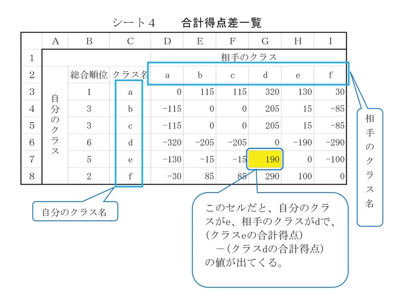 以上より、合計得点の差「自分のクラス-相手のクラス」を求めるためにセル「D3」入力する式は、「VLOOKUP($C3、総合結果!$A$2~$C$7、3)-VLOOKUP(D$2、総合結果!$A$2~$C$7、3) です。
