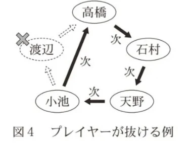 図4は、図1で示した手番の並びから「渡辺」が抜ける例である。この場合、「渡辺」の前にいる「小池」の次のプレイヤーは( コ )になる