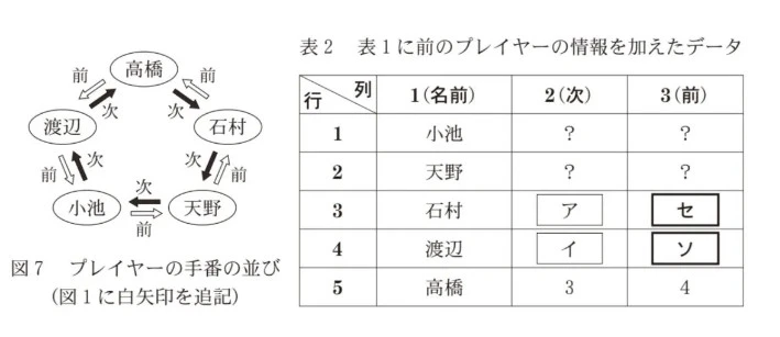 Aさんは、各プレイヤーの前の手番にいるプレイヤーを事前にすべて求めておけば、プレイヤーが手番の並びから抜ける手続きが簡素になると考えた。図7は、図1に「前のプレイヤー」を指し示す白矢印を追記した図である。表2は、図7の白矢印の情報を管理できるように、表1に「前のプレイヤー」の行番号を管理する列3を追加したものである。「高橋」を例にすると、「高橋」の前のプレイヤーは「渡辺」なので、表2において「高橋」の行の列3は4になる。同様に、「石村」と「渡辺」の行の列3は、それぞれ( セ )、( ソ )となる。なお、設問の都合により、表2の一部は値を「?」で隠している。