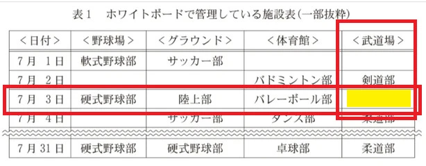 日付が「7月3日」の行と施設名が「武道場」の列が交差するマス(黄色の部分)を確認して、