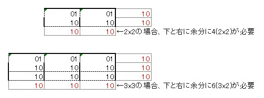 また、仮想的なマス目を、右と下に一列ずつ余分にくっつけて表現する必要があります。