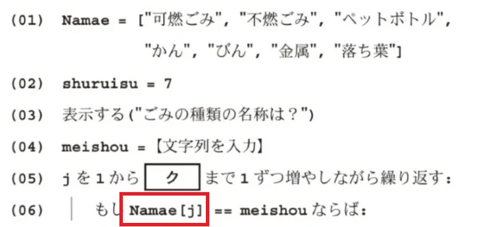 図5の(01)行目では、集めるごみの種類(1〜7)を添字とし、対応する名称を格納する配列Namaeを用意する。(02)行目では、変数shuruisuにごみの種類数として7を代入する。(04)行目では、入力されたごみの種類の名称を変数meishouに代入する。(05)〜(07)行目では、ごみの種類を表す数値を( ア )に代入する。