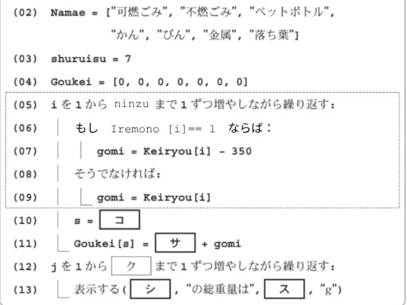 図5の(01)行目では、集めるごみの種類(1〜7)を添字とし、対応する名称を格納する配列Namaeを用意する。(02)行目では、変数shuruisuにごみの種類数として7を代入する。(04)行目では、入力されたごみの種類の名称を変数meishouに代入する。(05)〜(07)行目では、ごみの種類を表す数値を( ア )に代入する。