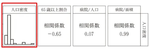 Sさんは、47都道府県を「人口密度」をもとに二つのグループに分けることにした。図2の「人口密度」のヒストグラムを見て、( カ )ことから、平均値をもとにして分けることが難しいと考え、「人口密度」の中央値(約0.078万人/km2)を基準にし、「人口密度」が中央値未満の都道府県をXグループ、中央値以上の都道府県をOグループとした。さらに、「65歳以上割合」と「病院/面積」の散布図(図3)を作成した。この散布図では、点の代わりにグループ名で表している。