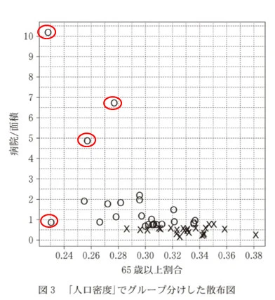 ・「病院/面積」の分散は、下図赤丸よりOグループの方が大きい