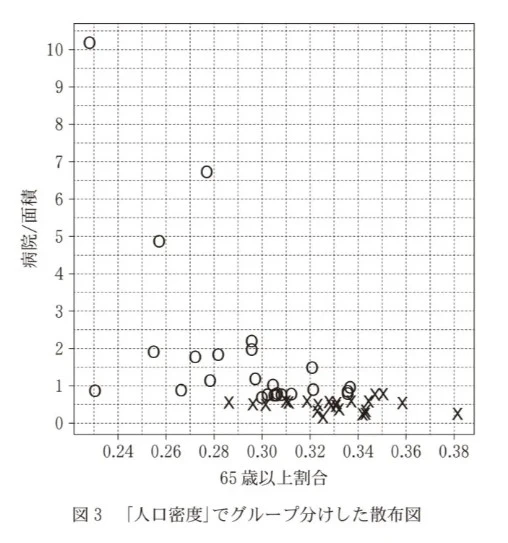 Oグループでは、「65歳以上割合」の大小によらず、面積km2あたりの病院数が1施設以上である